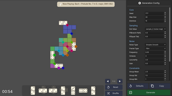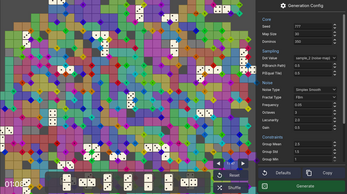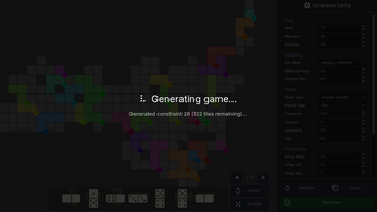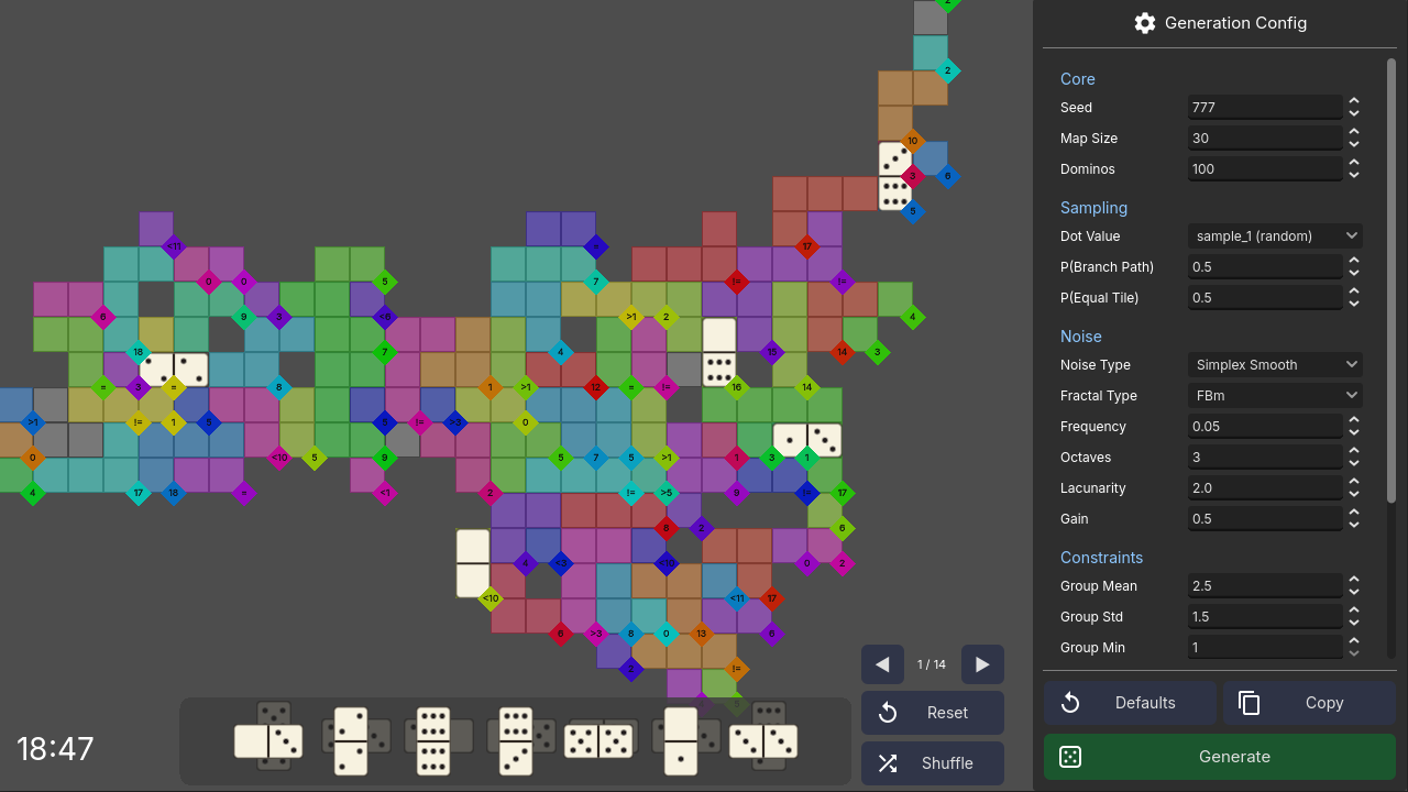 - Generation panel — tweak the seed, grid size, domino count, noise parameters, and constraint probabilities at runtime to craft your own challenge.